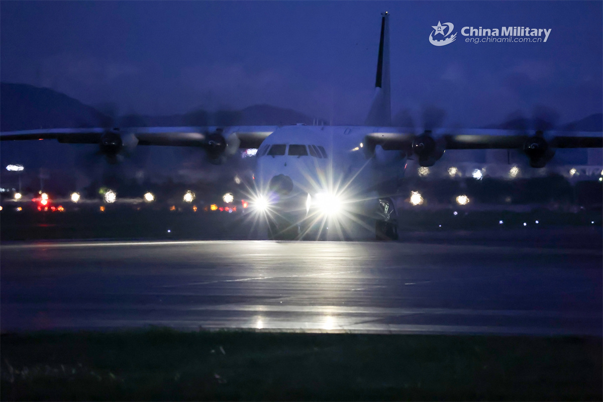 Y-9 transport aircraft attached to an aviation regiment with the navy under the Chinese PLA Eastern Theater Command lands on the training base during a day-and-night flight training exercise on August 21, 2025. (eng.chinamil.com.cn/Photo by Wang Haojing)