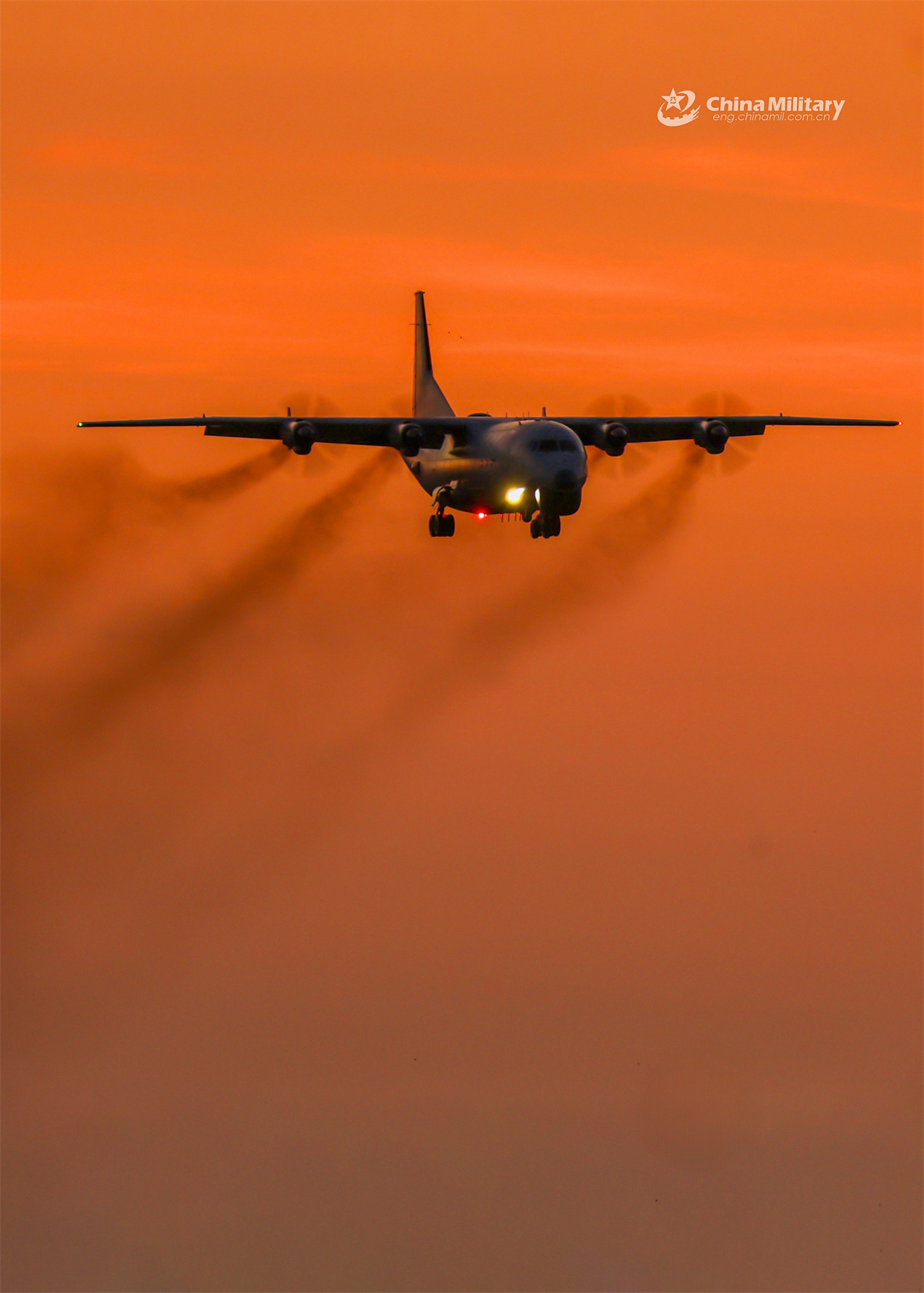 Y-9 transport aircraft attached to an aviation regiment with the navy under the Chinese PLA Eastern Theater Command flies at sunset during a day-and-night flight training exercise on August 21, 2025. (eng.chinamil.com.cn/Photo by Wang Haojing)