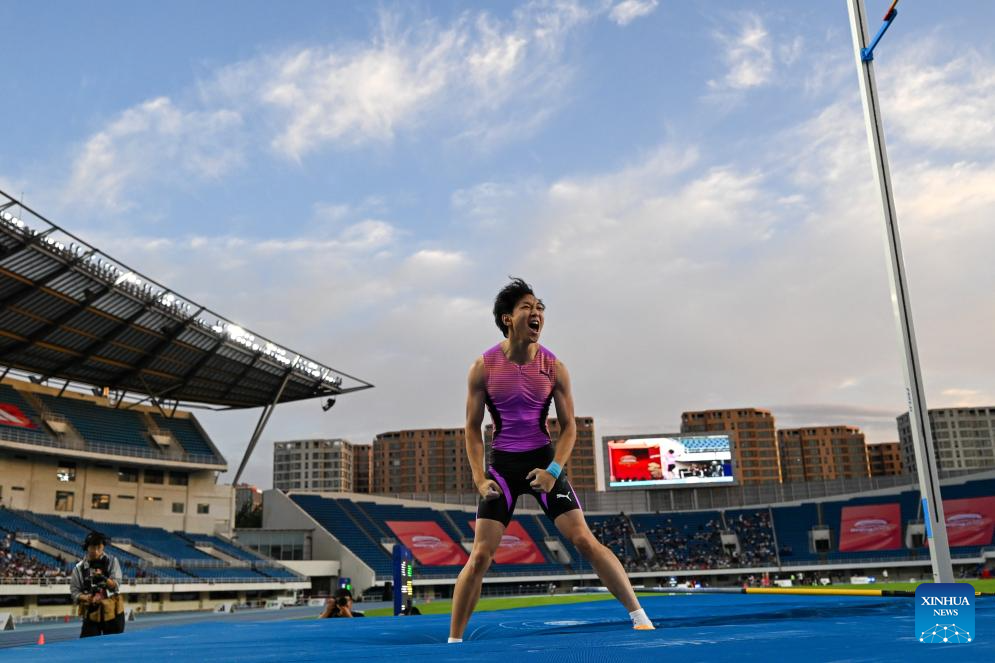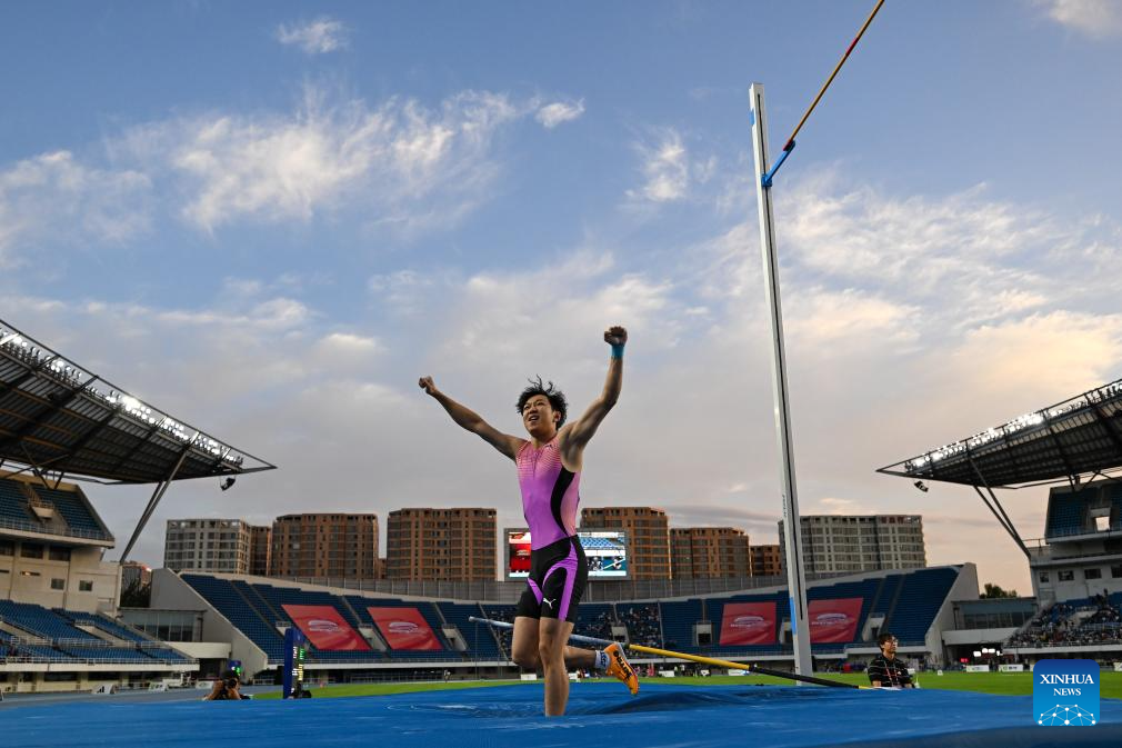 Zhong Tao of China celebrates during the Men's Pole Vault event at 2025 World Athletics Continental Tour in Beijing, China, on Sept. 7, 2025. (Xinhua/Ju Huanzong)