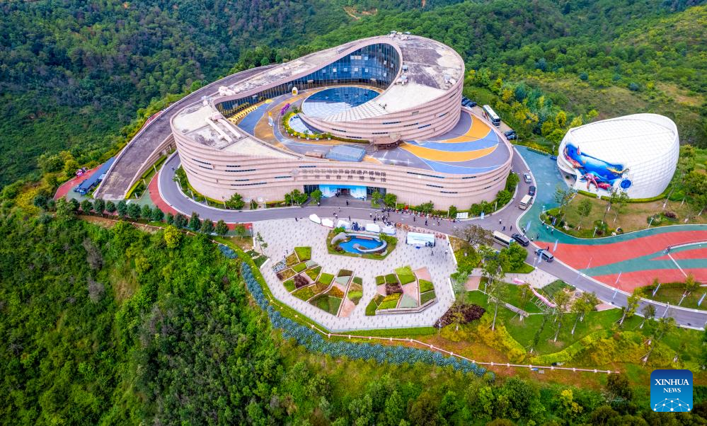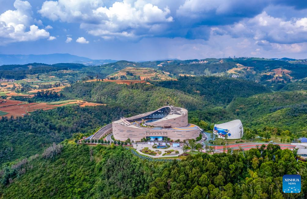 An aerial drone photo taken on Sept. 7, 2025 shows an outside view of the world natural heritage museum of the Chengjiang Fossil Site in Yuxi, southwest China's Yunnan Province. The Global South World Heritage Forum is held at the world natural heritage museum of the Chengjiang Fossil Site in Yuxi on Sunday. (Xinhua/Chen Xinbo)
