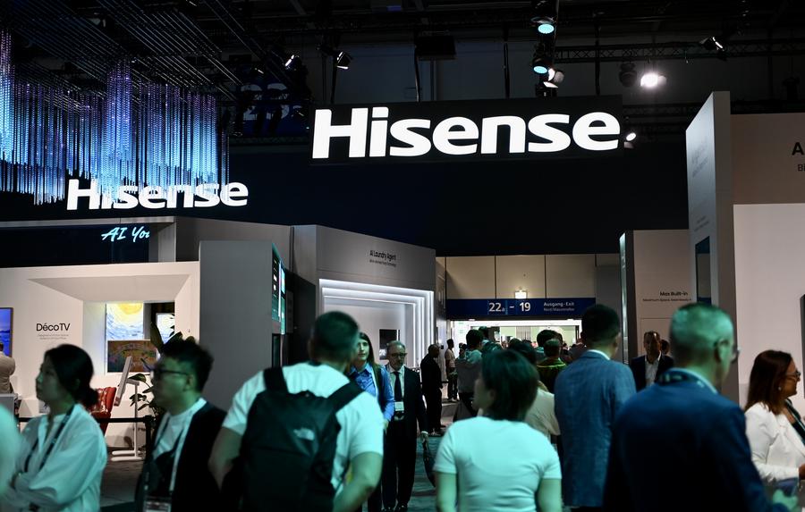 People visit the exhibition area of Hisense at IFA Berlin 2025 in Berlin, Germany, Sept. 5, 2025. IFA Berlin 2025, one of the world's largest trade fairs for consumer electronics and home appliances, opened Friday, spotlighting future-oriented themes such as information technology, artificial intelligence, software and computing power, and sustainable solutions for home, mobility, and lifestyle. (Xinhua/Zhang Haofu)