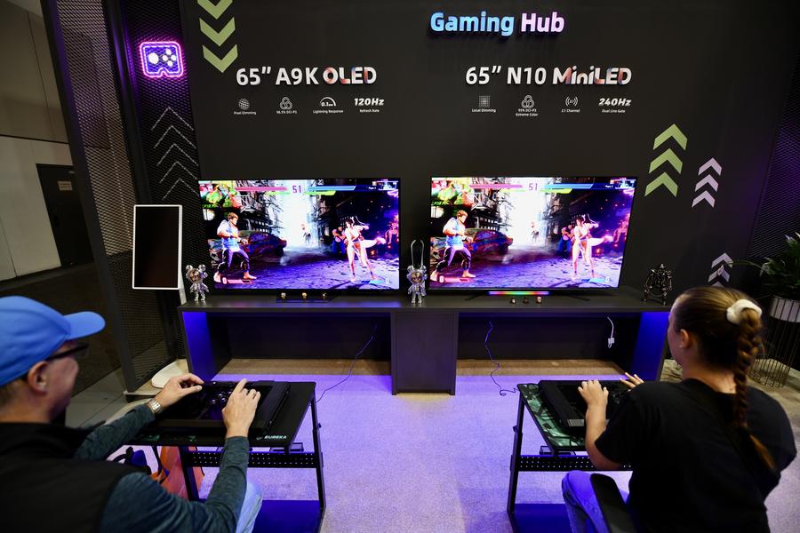 People try gaming devices at the exhibition area of CHANGHONG at IFA Berlin 2025 in Berlin, Germany, Sept. 5, 2025. IFA Berlin 2025, one of the world's largest trade fairs for consumer electronics and home appliances, opened here on Friday, spotlighting future-oriented themes such as information technology, artificial intelligence, software and computing power, and sustainable solutions for home, mobility, and lifestyle. (Xinhua/Zhang Haofu)