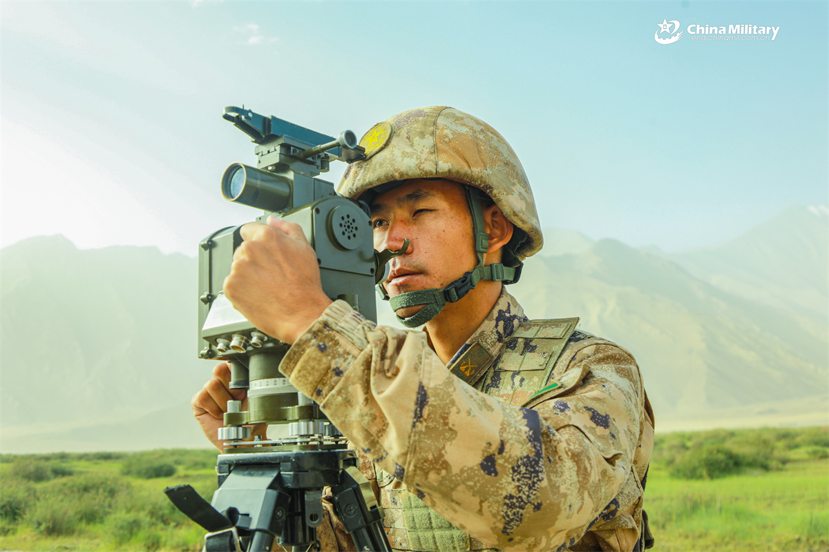 A soldier assigned to a chemical defense unit under the Chinese PLA Xinjiang Military Command conducts chemical surveillance with a stand-off chemical detector during a chemical detection and reconnaissance training exercise on August 28, 2025.(eng.chinamil.com.cn/Photo by Zhang Yuliang)