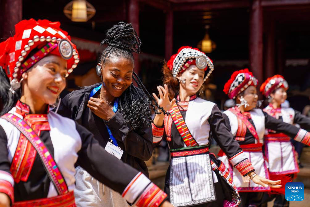 A guest (2nd L) to the 2025 Global South Media and Think Tank Forum dances with locals in Mile City of Honghe Hani and Yi Autonomous Prefecture, southwest China's Yunnan Province, Sept. 8, 2025. (Xinhua/Peng Yikai)