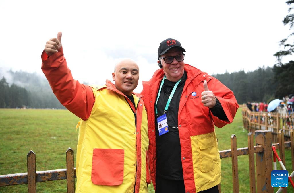 A guest (R) to the 2025 Global South Media and Think Tank Forum poses for photos at the Yulong Snow Mountain scenic spot in Lijiang City, southwest China's Yunnan Province, Sept. 8, 2025. (Xinhua/Jin Mamengni)