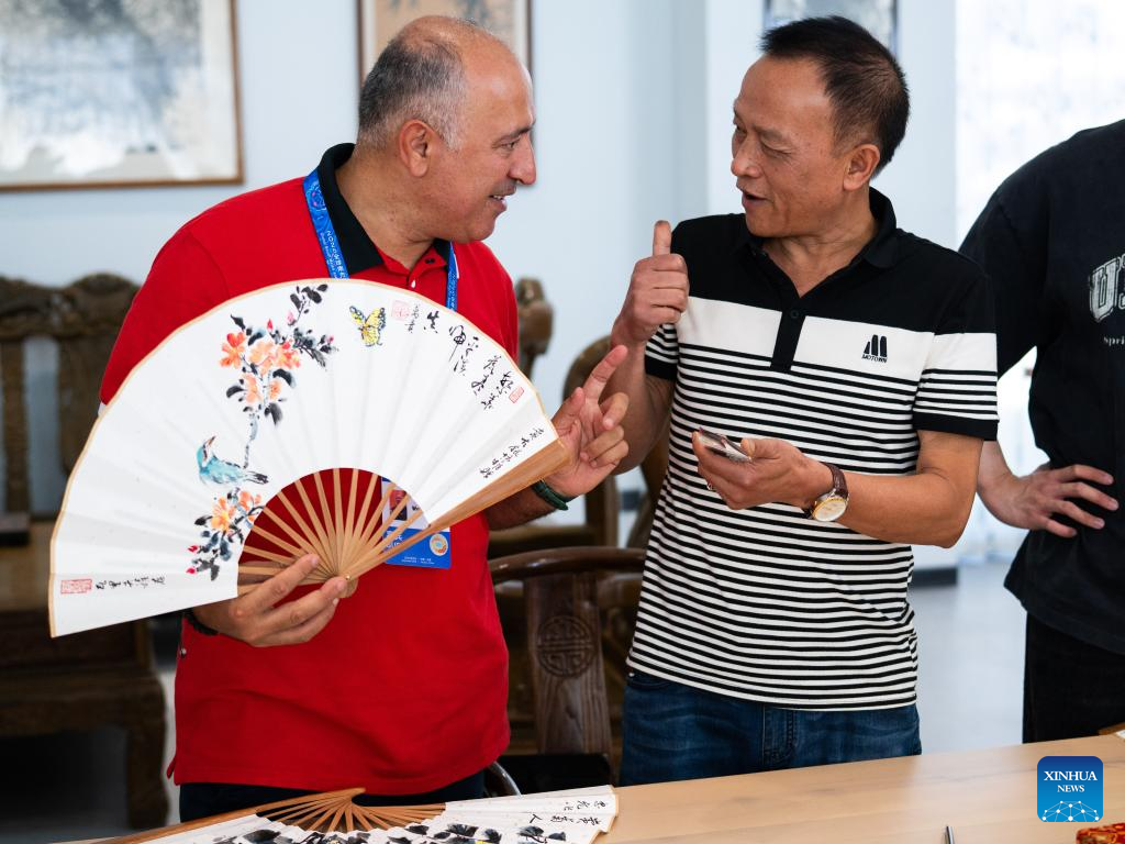 A guest (L) to the 2025 Global South Media and Think Tank Forum learns about fan painting in Mengzi City of Honghe Hani and Yi Autonomous Prefecture, southwest China's Yunnan Province, Sept. 8, 2025. (Xinhua/Gao Yongwei)