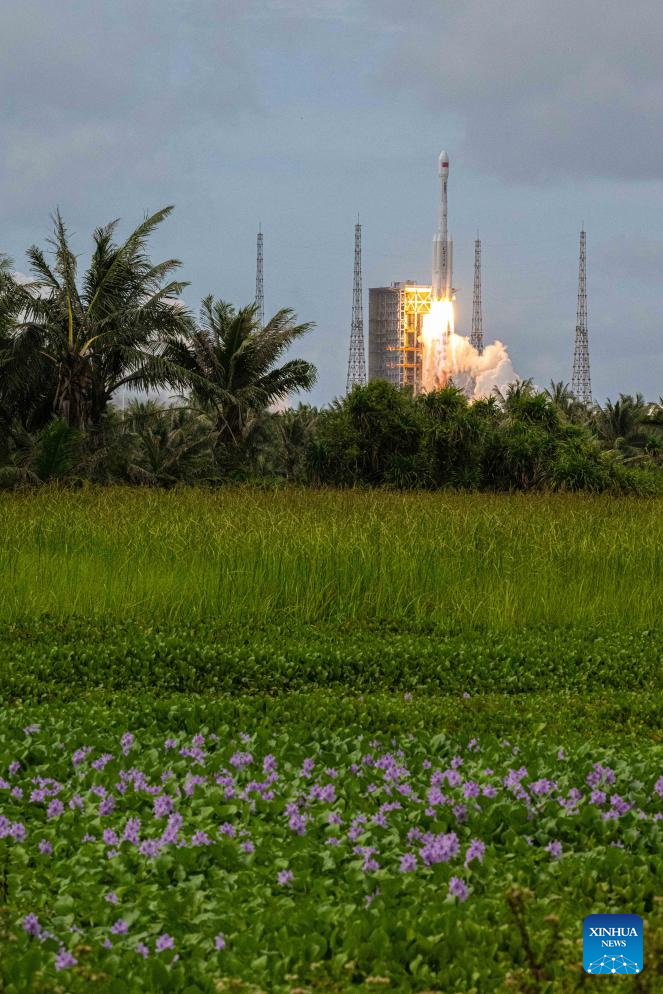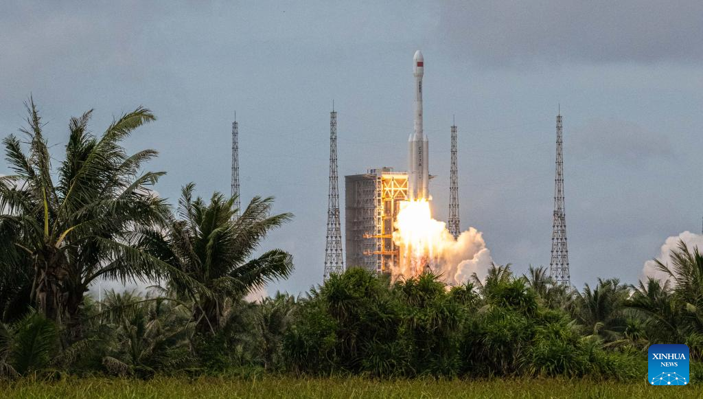 A modified Long March-7 carrier rocket carrying the Yaogan-45 satellite blasts off from the Wenchang Spacecraft Launch Site in south China's Hainan Province, Sept. 9, 2025. China launched a new remote sensing satellite from the Wenchang Spacecraft Launch Site in the southern island province of Hainan on Tuesday. The Yaogan-45 satellite was launched at 10 a.m. (Beijing Time) and has entered the preset orbit successfully. (Xinhua/Pu Xiaoxu)