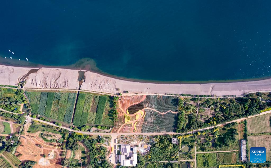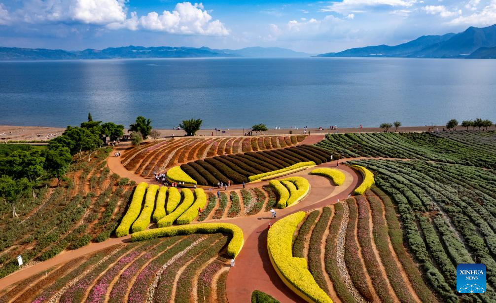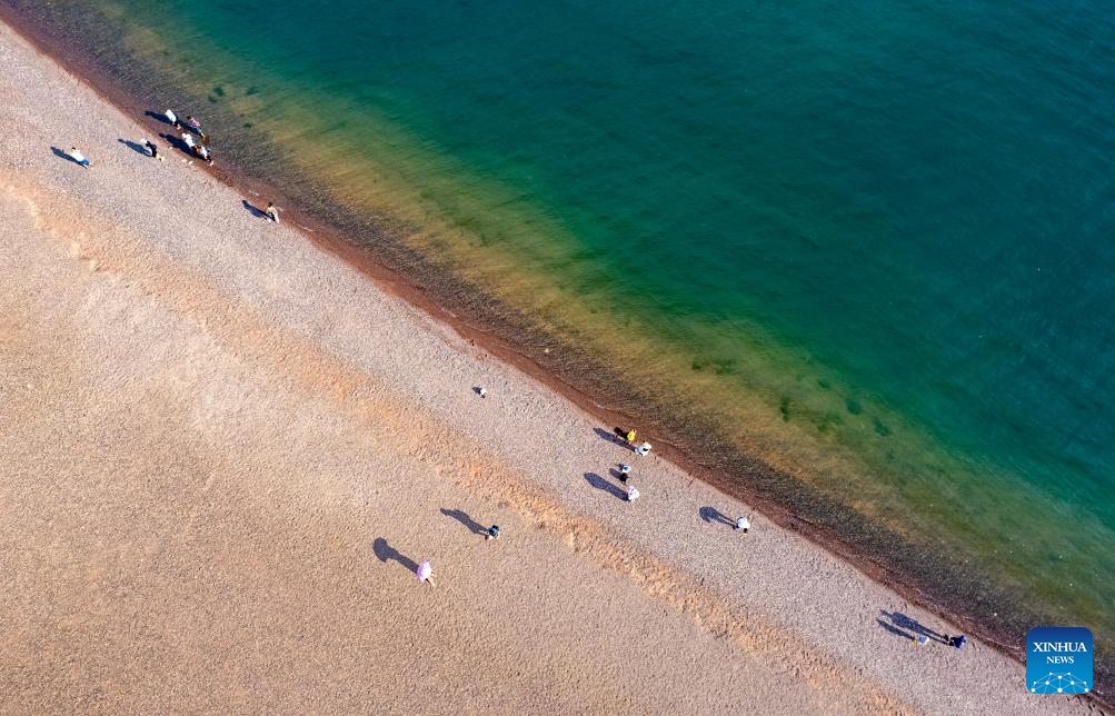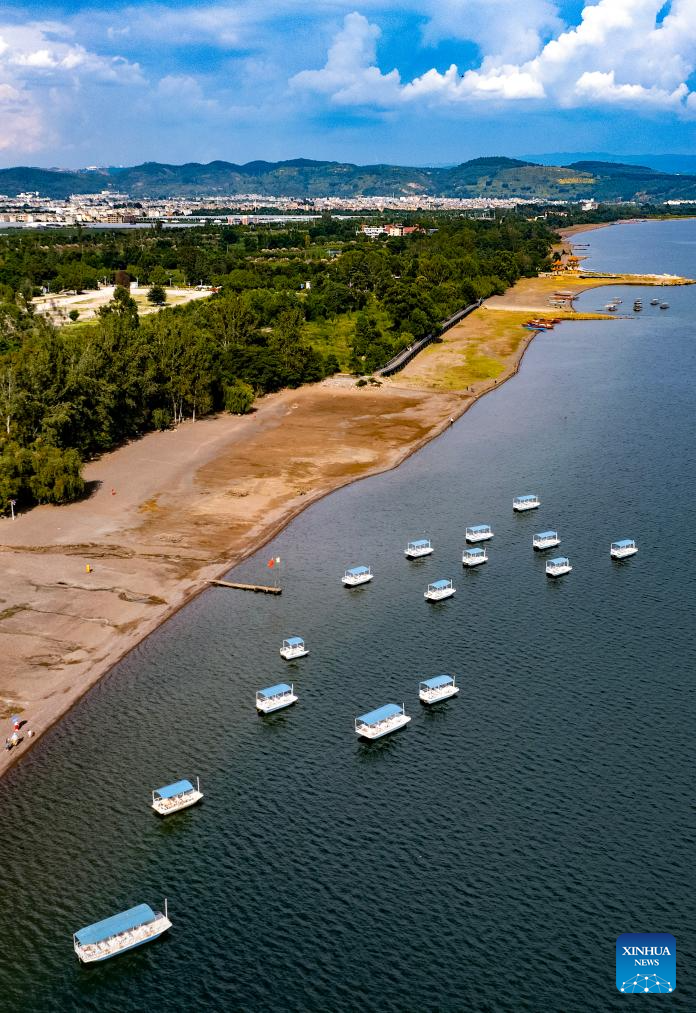 An aerial drone photo taken on Sept. 8, 2025 shows tourists enjoying themselves by Fuxian Lake in Yuxi City, southwest China's Yunnan Province. (Xinhua/Chen Xinbo)