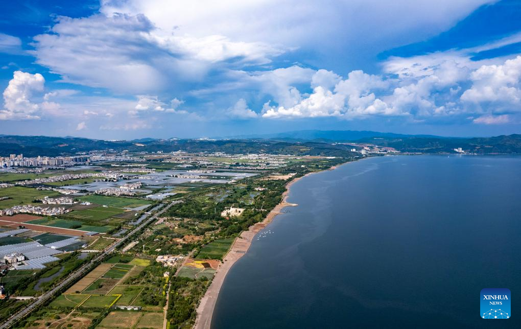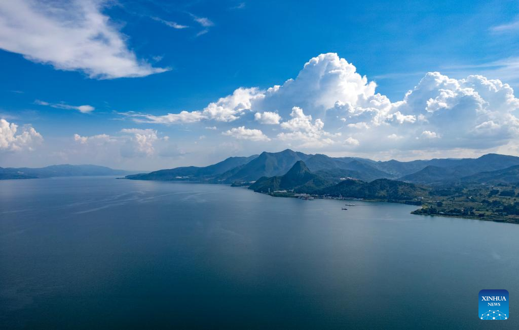 An aerial drone photo taken on Sept. 8, 2025 shows the scenery of Fuxian Lake in Yuxi City, southwest China's Yunnan Province. (Xinhua/Chen Xinbo)