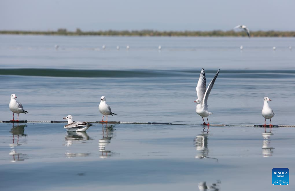 Birds are seen at a scenic spot of Ulunggur Lake in Fuhai County of Altay, northwest China's Xinjiang Uygur Autonomous Region, Sept. 8, 2025. (Xinhua/Cheng Li)