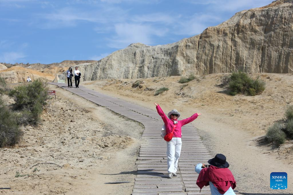 A tourist poses for photos at a scenic spot of Ulunggur Lake in Fuhai County of Altay, northwest China's Xinjiang Uygur Autonomous Region, Sept. 8, 2025. (Xinhua/Cheng Li)