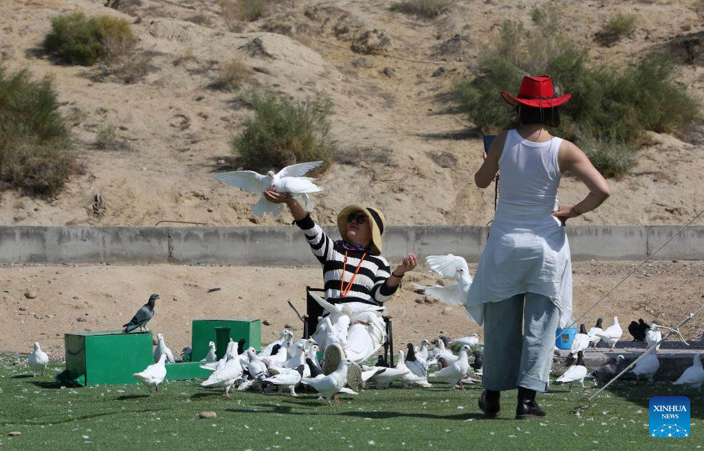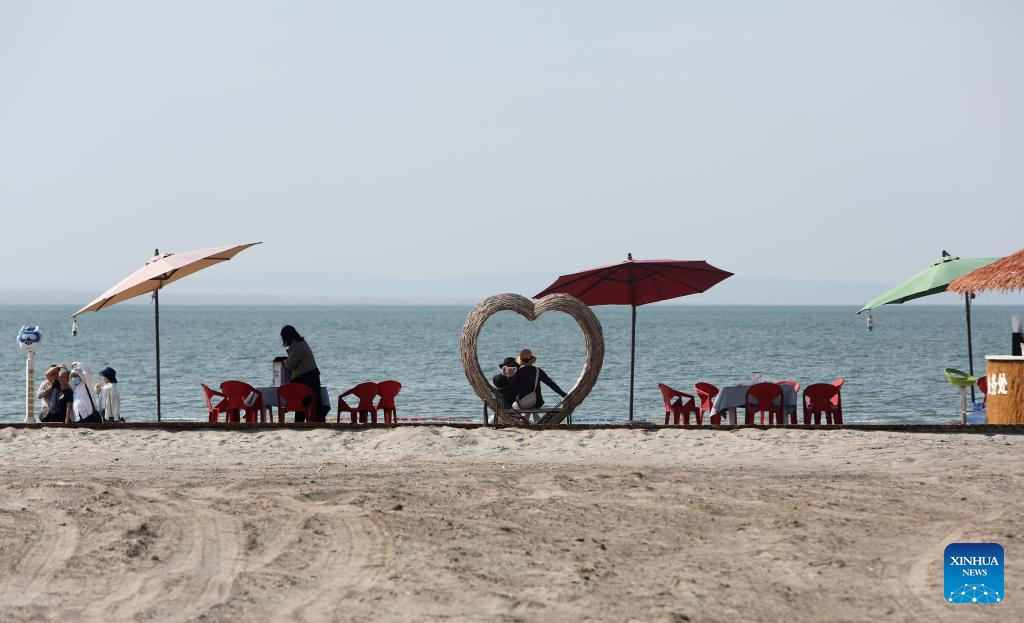 Tourists enjoy leisure time on the beach by the Ulunggur Lake in Fuhai County of Altay, northwest China's Xinjiang Uygur Autonomous Region, Sept. 8, 2025. (Xinhua/Cheng Li)
