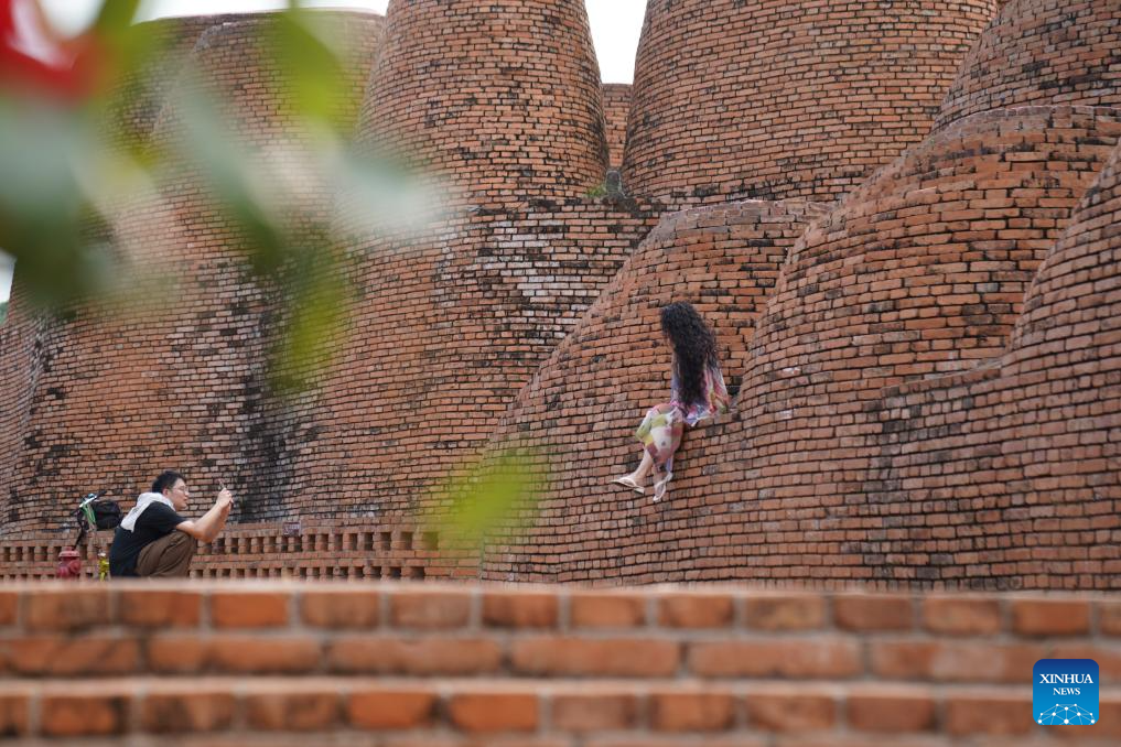 A tourist poses for photos at Dongfengyun town in Mile City of Honghe Hani and Yi Autonomous Prefecture, southwest China's Yunnan Province, Sept. 8, 2025. Dongfengyun is a town of specialties related to culture and art. It has kept introducing colorful tourist events and improving local scenery in recent years, and is now a heavily visited landmark for tourism in central Yunnan. (Xinhua/Peng Yikai)