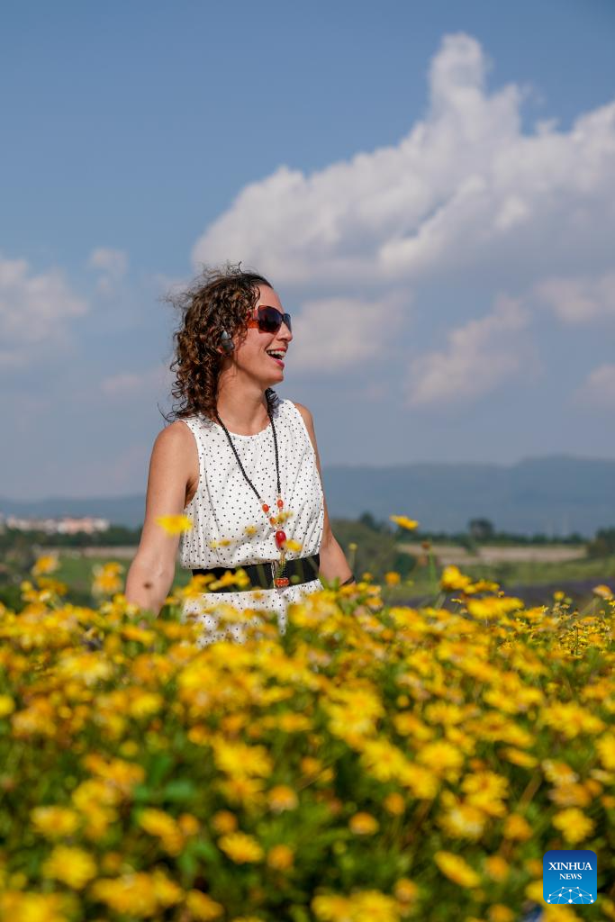 A tourist enjoys herself among flowering plants at Dongfengyun town in Mile City of Honghe Hani and Yi Autonomous Prefecture, southwest China's Yunnan Province, Sept. 8, 2025. Dongfengyun is a town of specialties related to culture and art. It has kept introducing colorful tourist events and improving local scenery in recent years, and is now a heavily visited landmark for tourism in central Yunnan. (Xinhua/Peng Yikai)