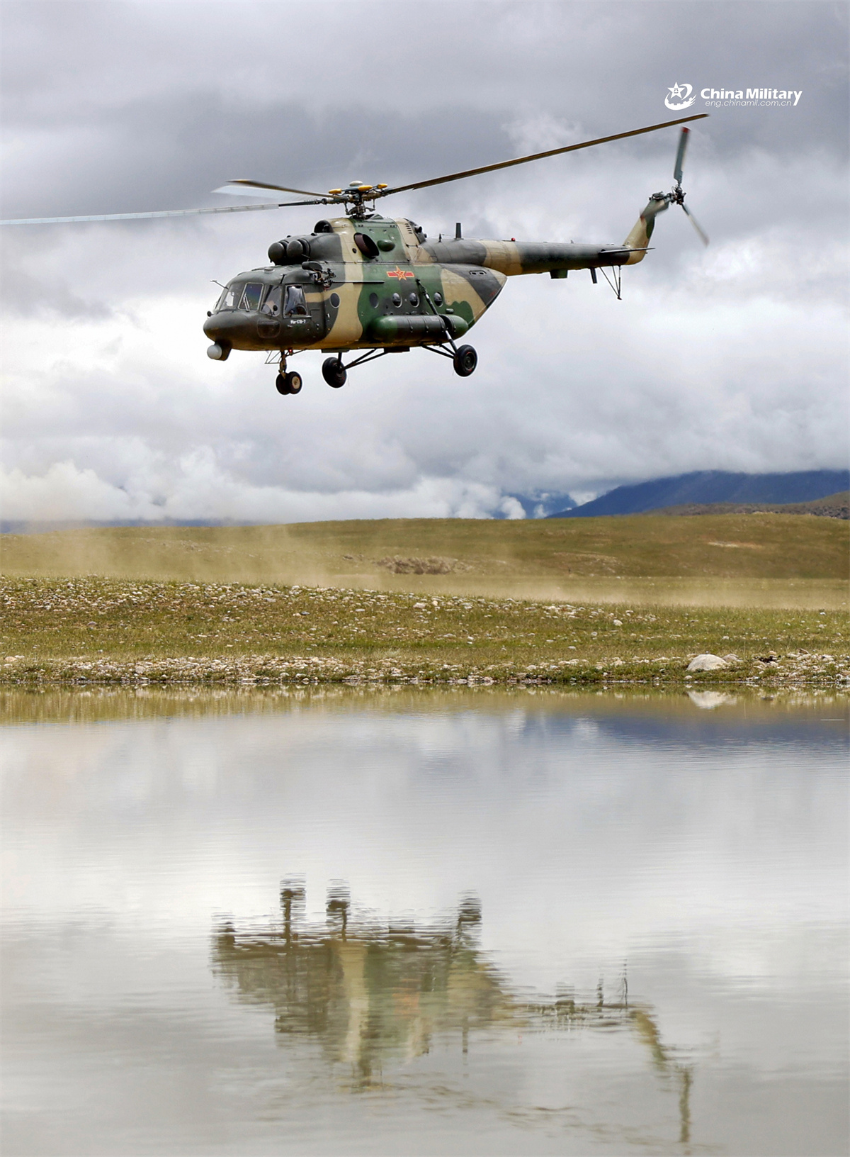 A Mi-17 transport helicopter attached to an army aviation brigade under the Chinese PLA Army hovers at an ultra-low altitude during a field flight training exercise. (eng.chinamil.com.cn/Photo by Hu Qiwu)