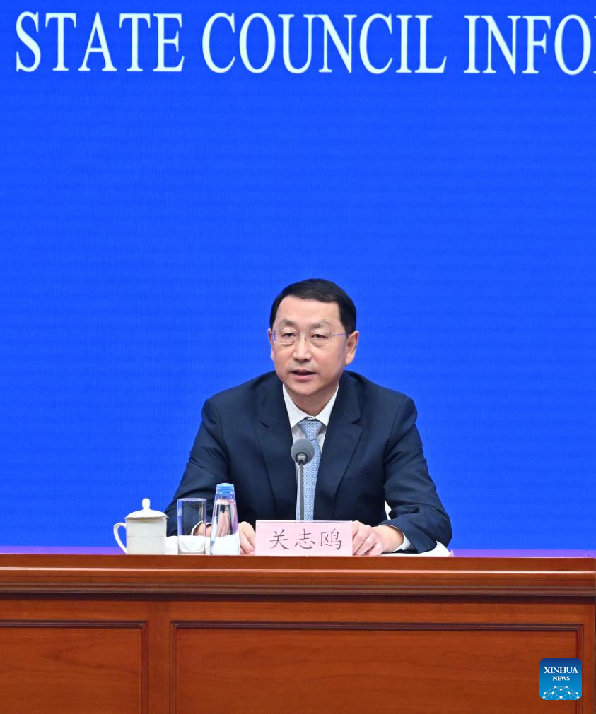 Guan Zhiou, minister of natural resources and general supervisor of national natural resources, speaks at a press conference held by the State Council Information Office (SCIO) on achievements in high-quality natural resources development during the 14th Five-Year Plan period (2021-2025) in Beijing, capital of China, Sept. 10, 2025. (Xinhua/Cai Yang)