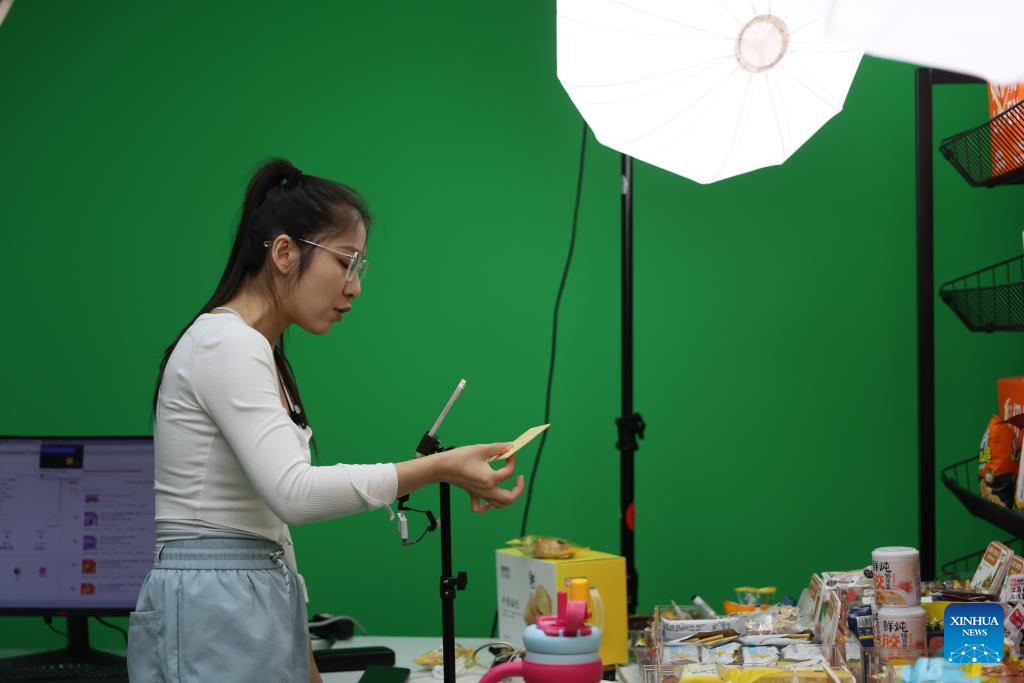 A livestreamer sells products at the Hongqiao Import Commodities Expo and Trade Center in Shanghai, east China, Sept. 9, 2025. (Xinhua/Wang Xiang)
