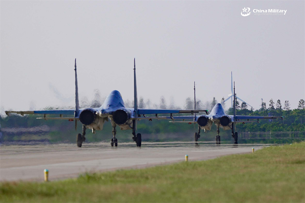 Two J-16 fighter jets attached to the air force under the Chinese PLA Eastern Theater Command taxi on the runway during a flight training exercise. (eng.chinamil.com.cn/Photo by Xiong Wei)