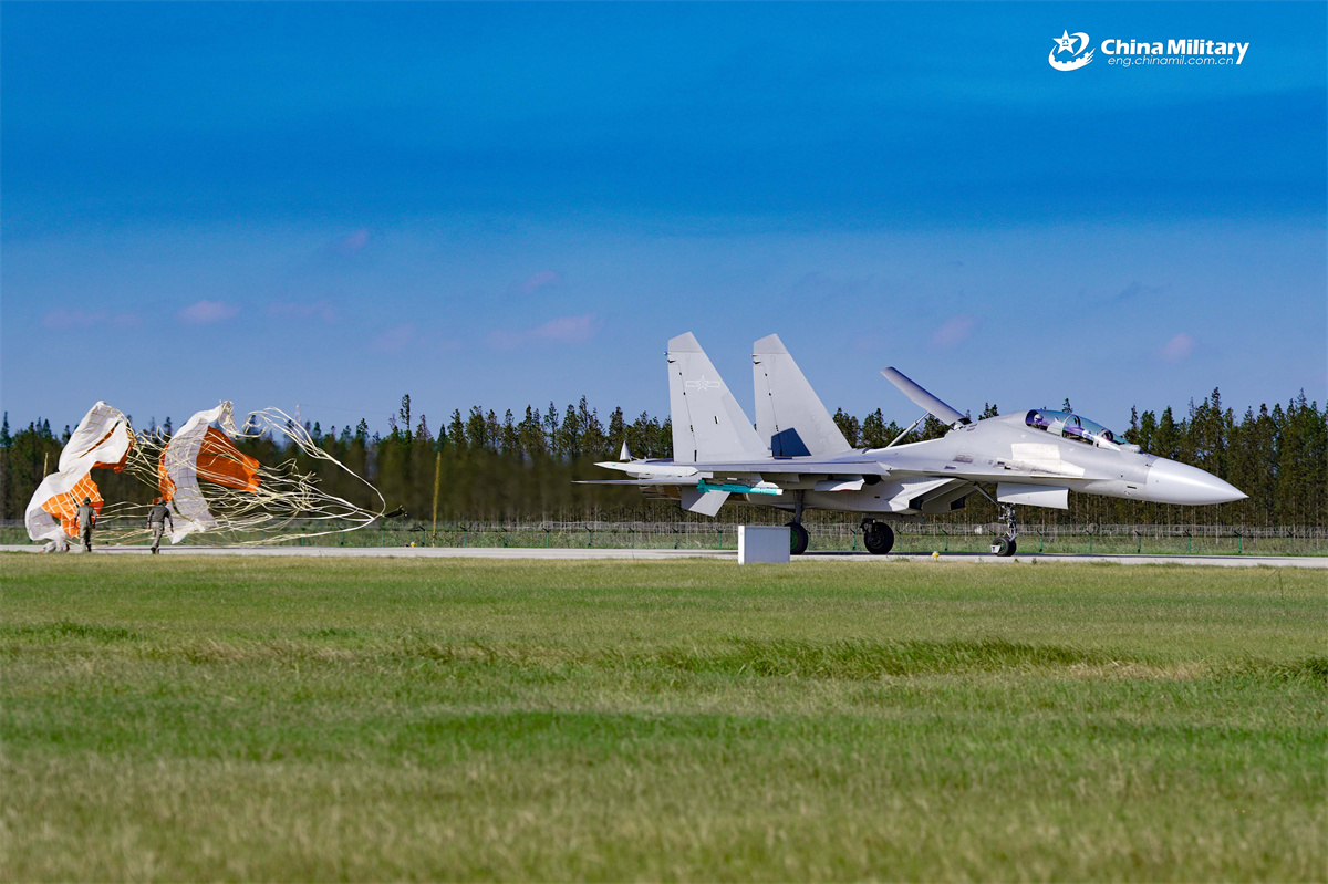 A J-16 fighter jet attached to the air force under the Chinese PLA Eastern Theater Command pops a drag parachute to slow down on the runway during a flight training exercise. (eng.chinamil.com.cn/Photo by Xiong Wei)