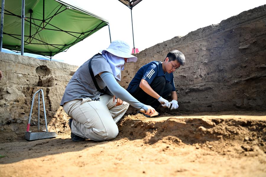 Archaeologists work during the sixth excavation of the Bairen Town site in Xingtai City, north China's Hebei Province, Sept. 10, 2025. (Xinhua/Mu Yu)
