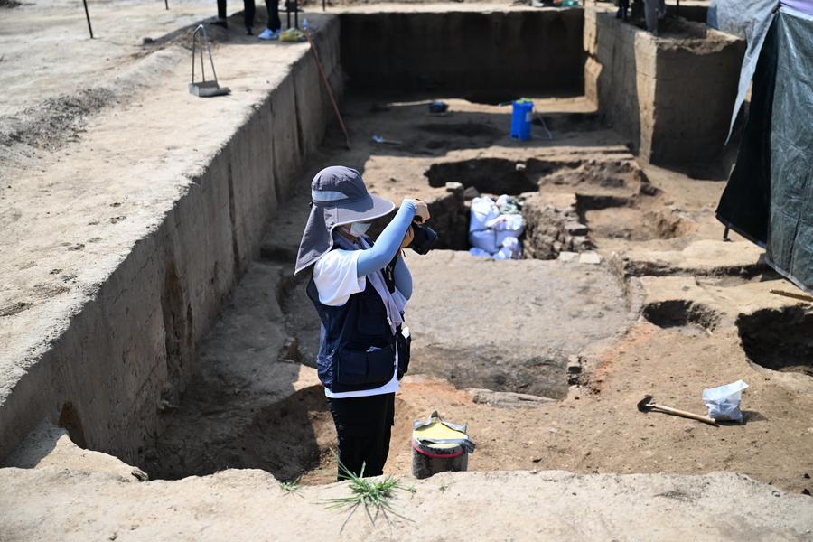 An archaeologist takes photos during the sixth excavation of the Bairen Town site in Xingtai City, north China's Hebei Province, Sept. 10, 2025. (Xinhua/Mu Yu)