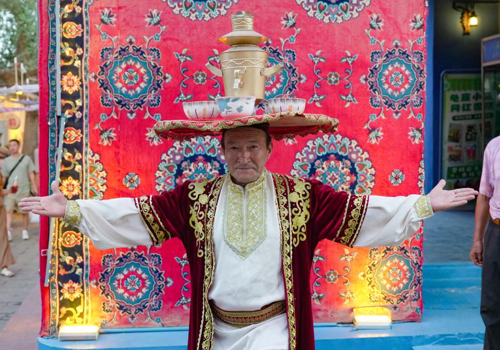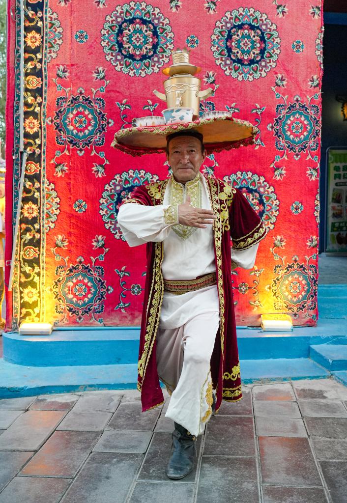 An artist performs the Samawar dance at the Grand Bazaar in Urumqi, northwest China's Xinjiang Uygur Autonomous Region, Sept. 9, 2025. In the Qiuci Alley of Kuqa City, northwest China's Xinjiang Uygur Autonomous Region, Parhat Emin performs the Samawar (a Uygur term meaning "tea set") dance, a traditional Uygur greeting dance with a history dating back to the millennium-old ancient Qiuci State. His eyes shine brightly, and his smile is warm and welcoming. With a bronze pot and porcelain bowls balanced steadily on a plate over his head, his body spins smoothly, and his feet move as lightly as the wind. As he dances gracefully to the rhythm of traditional Uygur music, the surrounding audience burst into cheers from time to time. (Xinhua/Wang Fei)