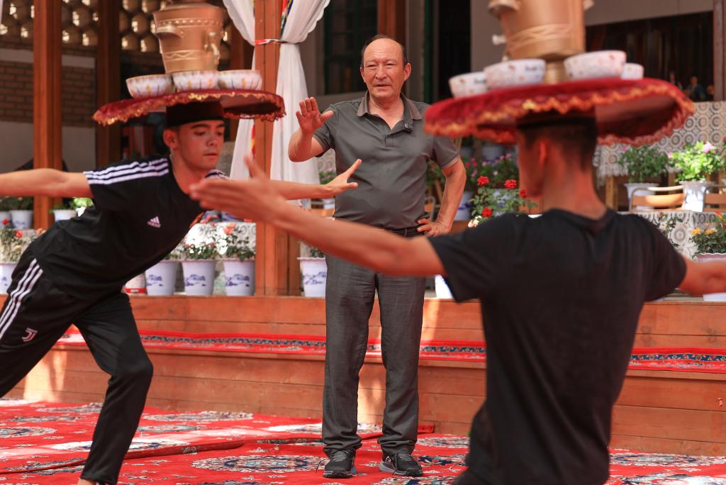 Parhat Emin (1st R) teaches young dancers the move of Samawar dance in the Qiuci Alley of Kuqa City, northwest China's Xinjiang Uygur Autonomous Region, July 22, 2025. In the Qiuci Alley of Kuqa City, northwest China's Xinjiang Uygur Autonomous Region, Parhat Emin performs the Samawar (a Uygur term meaning "tea set") dance, a traditional Uygur greeting dance with a history dating back to the millennium-old ancient Qiuci State. His eyes shine brightly, and his smile is warm and welcoming. With a bronze pot and porcelain bowls balanced steadily on a plate over his head, his body spins smoothly, and his feet move as lightly as the wind. As he dances gracefully to the rhythm of traditional Uygur music, the surrounding audience burst into cheers from time to time. (Xinhua/Wang Fei)
