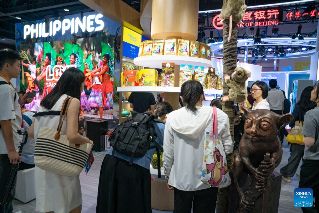 Visitors learn about Philippine products at the Philippine pavilion of the thematic exhibitions during the 2025 China International Fair for Trade in Services (CIFTIS) at Shougang Park in Beijing, capital of China, Sept. 10, 2025. The 2025 CIFTIS opened in Beijing on Wednesday, themed "Embrace Intelligent Technologies, Empower Trade in Services." (Xinhua/Ding He)