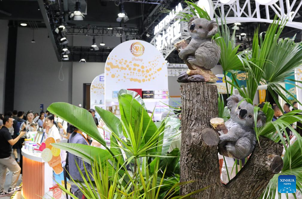 Visitors learn about dairy products at the Australian pavilion of the thematic exhibitions during the 2025 China International Fair for Trade in Services (CIFTIS) at Shougang Park in Beijing, capital of China, Sept. 10, 2025. The 2025 CIFTIS opened in Beijing on Wednesday, themed "Embrace Intelligent Technologies, Empower Trade in Services." (Xinhua/Xu Qin)
