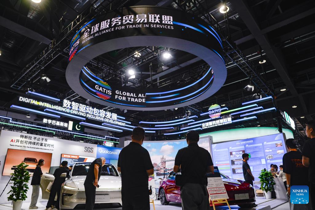 This photo taken on Sept. 10, 2025 shows the booth of the Global Alliance for Trade in Services of the thematic exhibitions during the 2025 China International Fair for Trade in Services (CIFTIS) at Shougang Park in Beijing, capital of China. The 2025 CIFTIS opened in Beijing on Wednesday, themed "Embrace Intelligent Technologies, Empower Trade in Services." (Xinhua/Xu Qin)