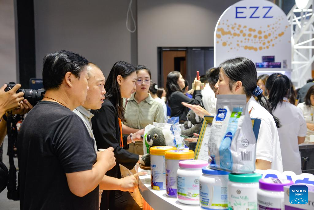 Visitors learn about health products at the Australian pavilion of the thematic exhibitions during the 2025 China International Fair for Trade in Services (CIFTIS) at Shougang Park in Beijing, capital of China, Sept. 10, 2025. The 2025 CIFTIS opened in Beijing on Wednesday, themed "Embrace Intelligent Technologies, Empower Trade in Services." (Xinhua/Xu Qin)