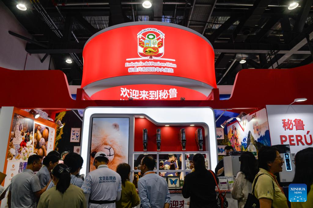 Visitors visit the Peruvian booth of the thematic exhibitions during the 2025 China International Fair for Trade in Services (CIFTIS) at Shougang Park in Beijing, capital of China, Sept. 10, 2025. The 2025 CIFTIS opened in Beijing on Wednesday, themed "Embrace Intelligent Technologies, Empower Trade in Services." (Xinhua/Xu Qin)