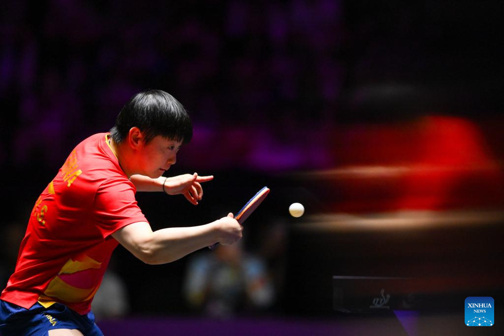 Sun Yingsha of China competes during the women's singles round of 32 match against Anna Hursey of Wales at the 2025 World Table Tennis (WTT) Champions Macao in Macao, south China, Sept.10, 2025. (Xinhua/Cheong Kam Ka)