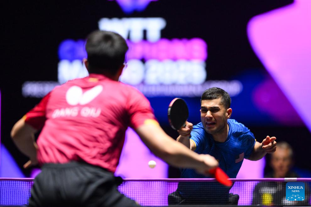 Kanak Jha (R) of the United States hits a return during the men's singles round of 32 match against Qiu Dang of Germany at the 2025 World Table Tennis (WTT) Champions Macao in Macao, south China, Sept.10, 2025. (Xinhua/Cheong Kam Ka)