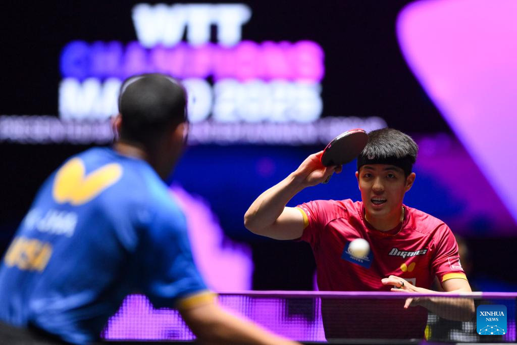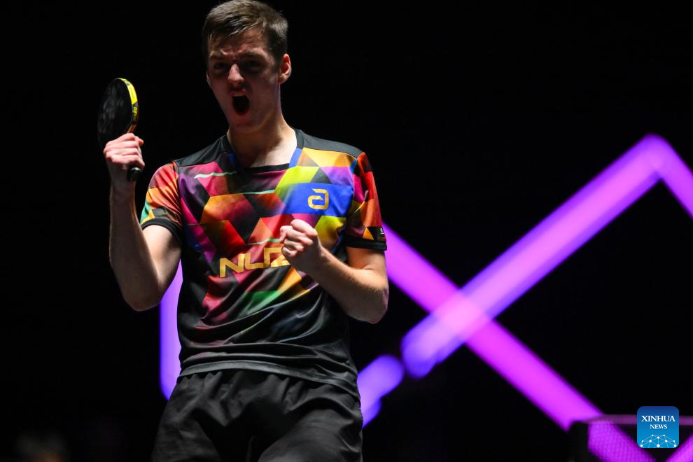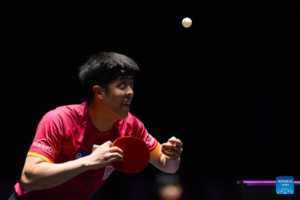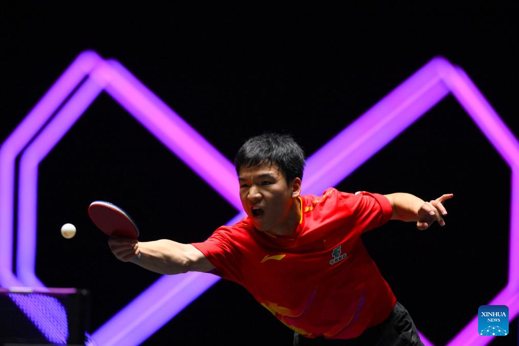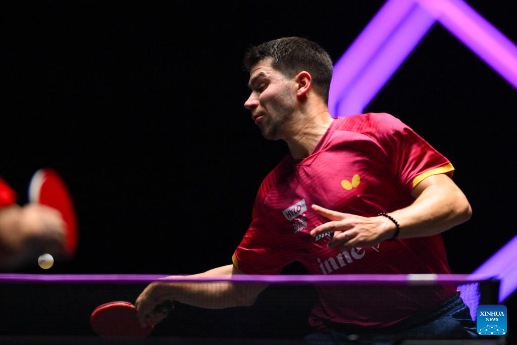 Qiu Dang of Germany hits a return during the men's singles round of 32 match against Kanak Jha of the United States at the 2025 World Table Tennis (WTT) Champions Macao in Macao, south China, Sept.10, 2025. (Xinhua/Cheong Kam Ka)