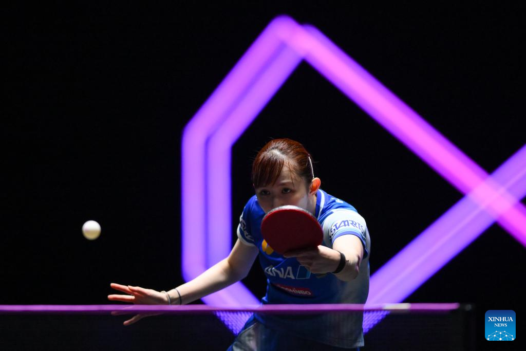 Hayata Hina of Japan hits a return during the women's singles round of 32 match against Huang Yi-Hua of Chinese Taipei at the 2025 World Table Tennis (WTT) Champions Macao in Macao, south China, Sept.10, 2025. (Xinhua/Cheong Kam Ka)