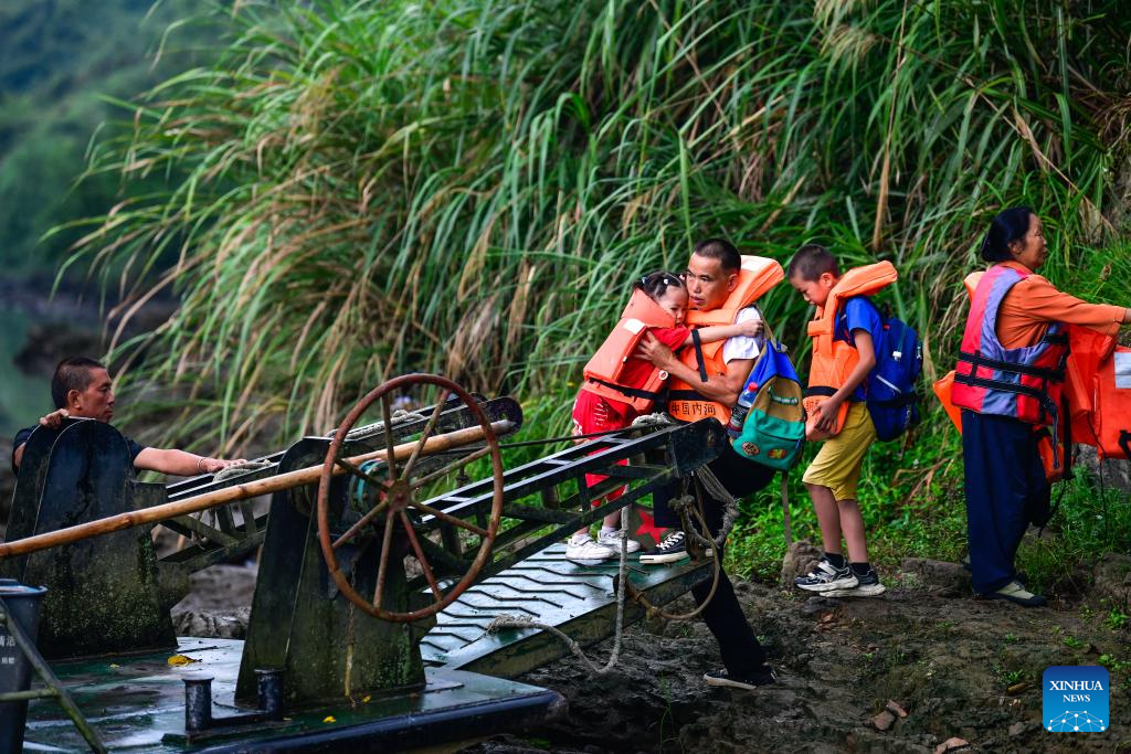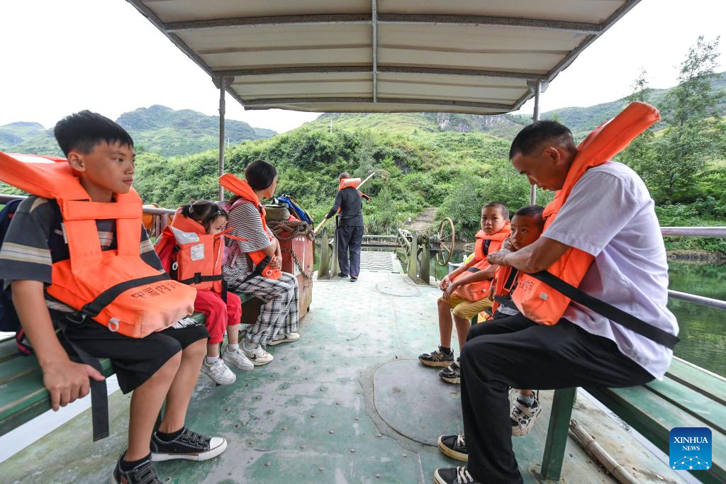 Ren Dabing (3rd L) and his students take a ferry boat to cross the Huayuan River between southwest China's Guizhou Province and central China's Hunan Province on their way to school, Sept. 9, 2025. (Xinhua/Yang Wenbin)