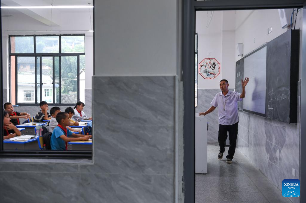 Ren Dabing gives a lesson at Molao Youyi Primary School in Biancheng Town of Huayuan County, central China's Hunan Province, Sept. 9, 2025. (Xinhua/Yang Wenbin)