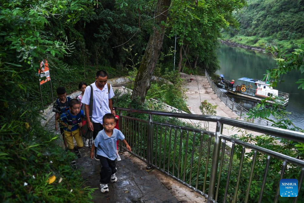 Ren Dabing (1st R) and his students take a ferry boat on their way home after school in Wansen Village, Yajia Town, Songtao Miao Autonomous County, southwest China's Guizhou Province, Sept. 9, 2025. (Xinhua/Yang Wenbin)
