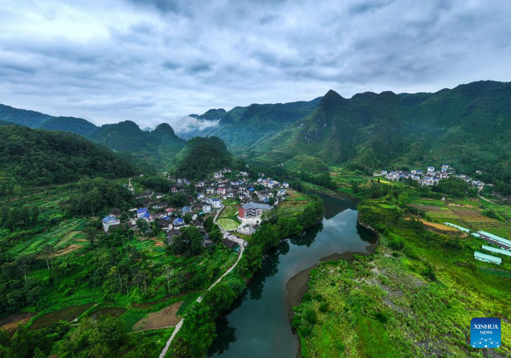 An aerial drone photo taken on Sept. 9, 2025 shows the Huayuan River between Wansen Village of Yajia Town, Songtao Miao Autonomous County, southwest China's Guizhou Province and Molao Village in Biancheng Town of Huayuan County, central China's Hunan Province. (Xinhua/Yang Wenbin)
