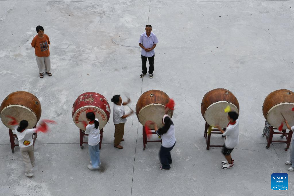 Ren Dabing (rear, R) instructs students playing the drum of the Miao ethnic group at Molao Youyi Primary School in Biancheng Town of Huayuan County, central China's Hunan Province, Sept. 9, 2025. (Xinhua/Yang Wenbin)