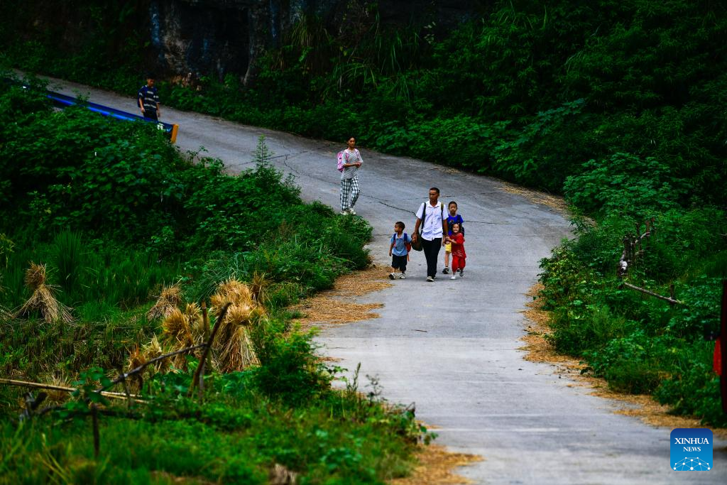 Ren Dabing (2nd L) and his students are on their way home after school in Wansen Village, Yajia Town, Songtao Miao Autonomous County, southwest China's Guizhou Province, Sept. 9, 2025. (Xinhua/Yang Wenbin)