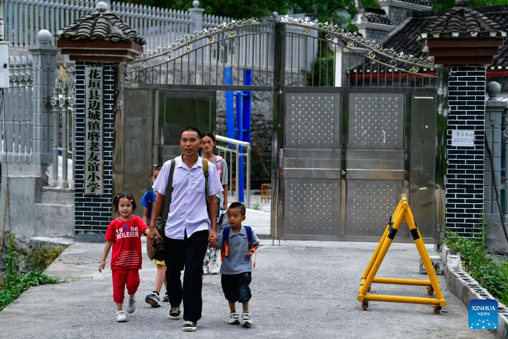 Ren Dabing and his students are on their way home from Molao Youyi Primary School in Biancheng Town of Huayuan County, central China's Hunan Province, Sept. 9, 2025. (Xinhua/Yang Wenbin)
