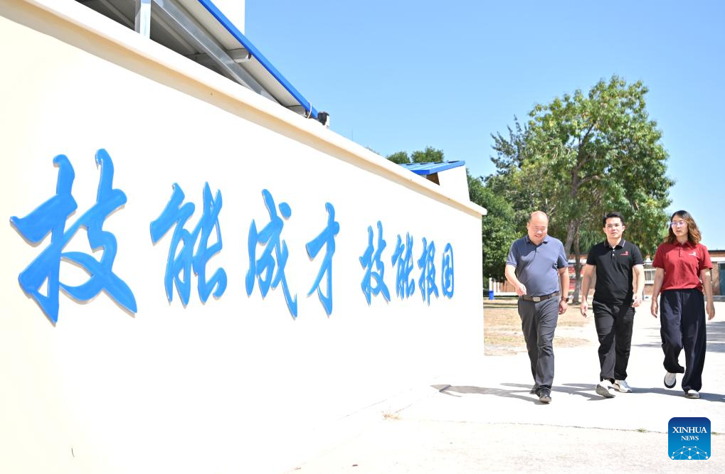 Wu Yuanzhou instructs a student in practice at the bricklaying training base of Tianjin Railway Technical and Vocational College in Tianjin, north China, Sept. 9, 2025. (Xinhua/Li Ran)