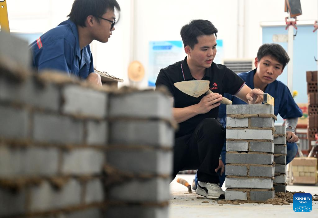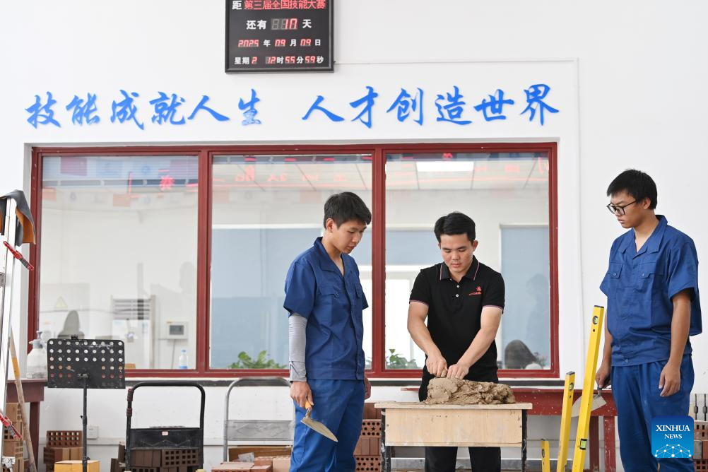 Wu Yuanzhou instructs students in practice at the bricklaying training base of Tianjin Railway Technical and Vocational College in Tianjin, north China, Sept. 9, 2025. (Xinhua/Zhao Zishuo)
