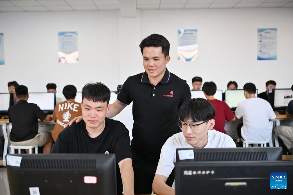 Wu Yuanzhou instructs students during a class on computer-aided designing (CAD) in Tianjin, north China, Sept. 9, 2025. (Xinhua/Li Ran)