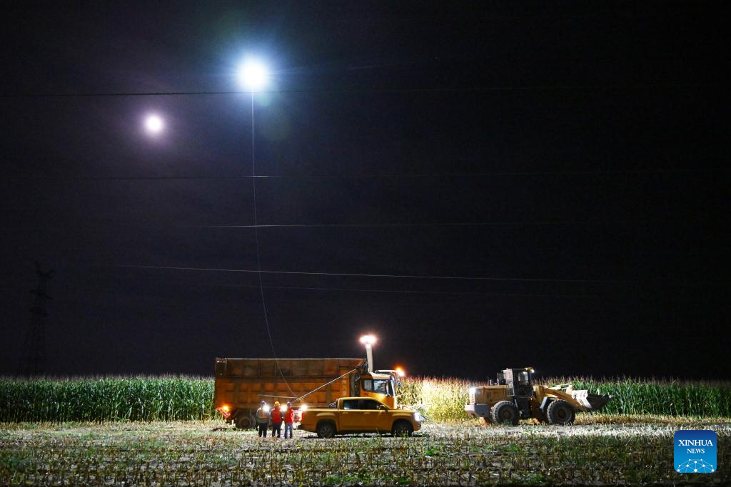 Villagers harvest corns during night in Liangtian Town of Jinfeng District in Yinchuan City, northwest China's Ningxia Hui Autonomous Region, Sept. 10, 2025. (Photo by Yuan Hongyan/Xinhua)