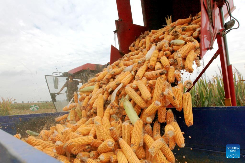 Villagers load harvested corns onto a truck in Baotai Town of Pingyi County in Linyi City, east China's Shandong Province, Sept. 11, 2025. (Photo by Wu Jiquan/Xinhua)