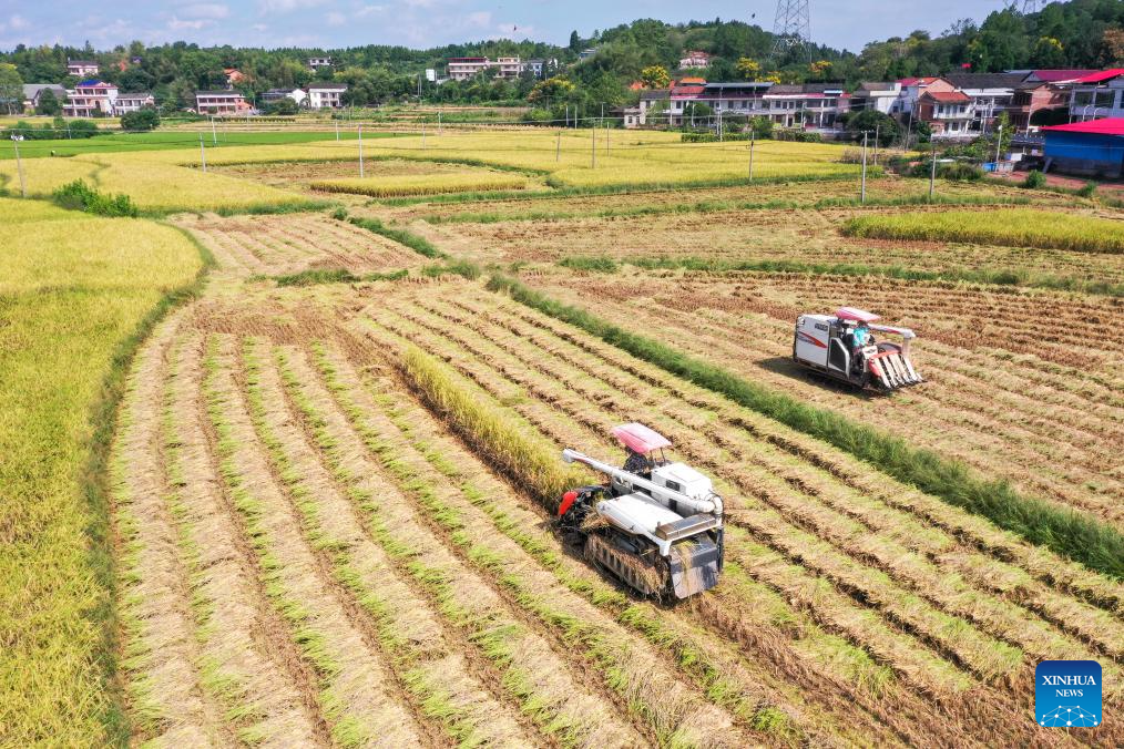 An aerial drone photo shows harvesters working in a rice field in Hengyang County of Hengyang City, central China's Hunan Province Sept. 11, 2025. (Photo by Liu Xinrong/Xinhua)