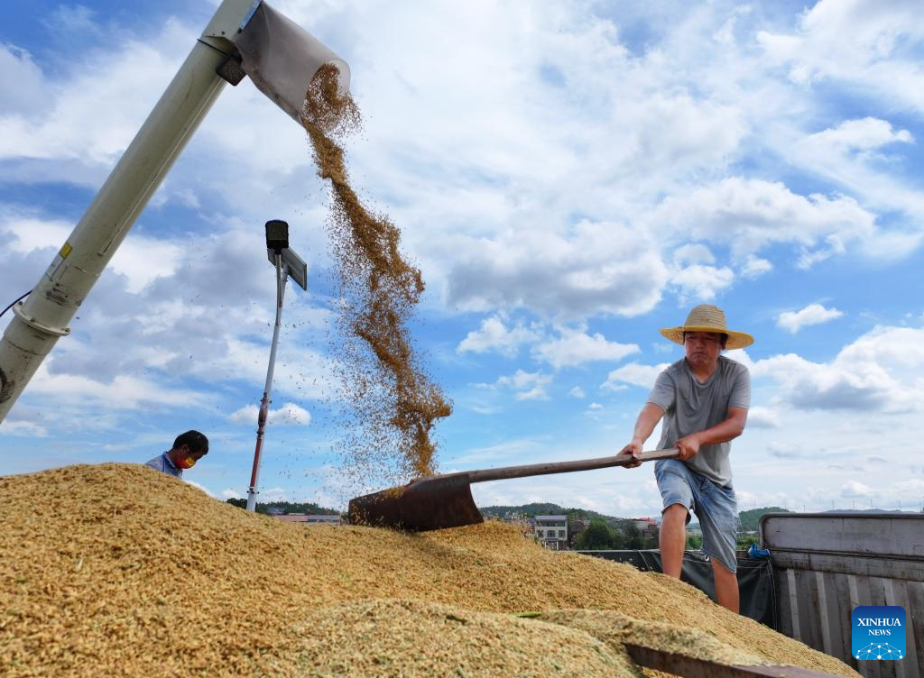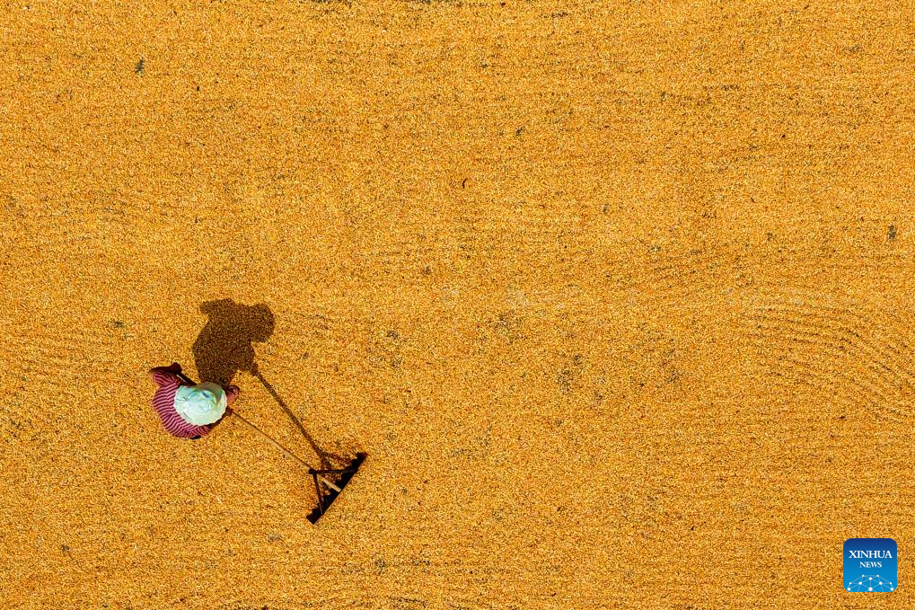 A drone photo shows farmers harvesting rice in Shitan Township of Hengdong County in Hengyang City, central China's Hunan Province, Sept. 11, 2025. (Photo by Cao Zhengping/Xinhua)